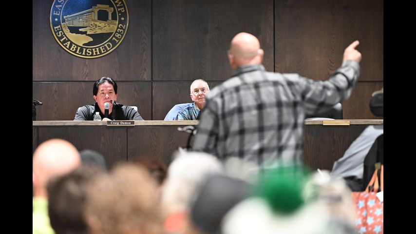 Mike Petak of Spring City gestures while speaking to East Vincent Township supervisors in opposition to a data center proposal at the former Pennhurst state hospital grounds, Dec. 17, 2025, in Spring City, Pa. (AP Photo/Marc Levy)