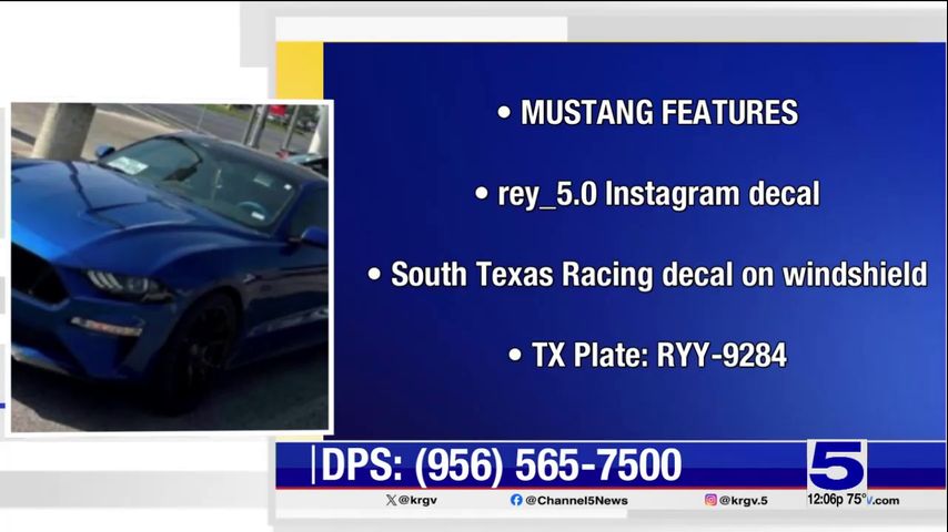 District attorney Luis Saenz said the driver of the Ford Mustang was involved in the accident. He said identifiers of the vehicle include an Instagram decal that says 'rey_5.0' and 'South Texas Racing' on the front windshield. The license plate on the vehicle is RYY9284.