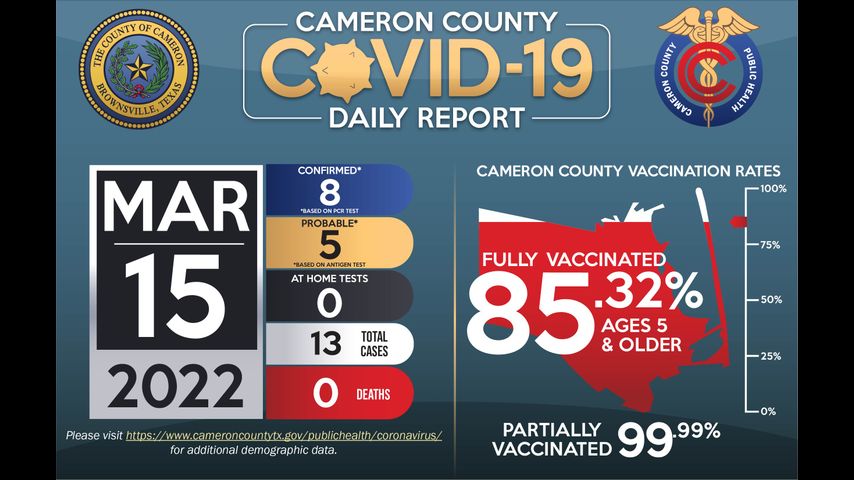 Los esfuerzos de vacunación continúan en todo el condado de Cameron; actualmente, el 85.32% de la población de cinco años y más está completamente vacunada.