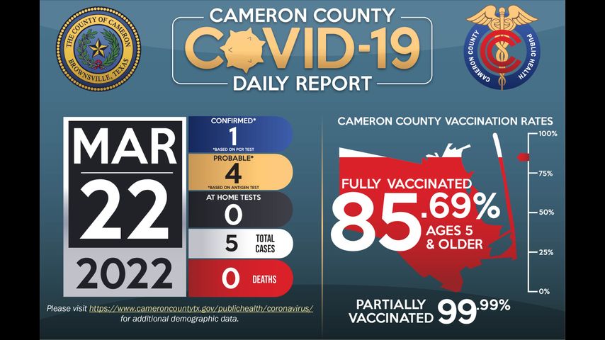 Los esfuerzos de vacunación continúan en todo el condado de Cameron; actualmente, el 85,69% de la población de cinco años y más está completamente vacunada.