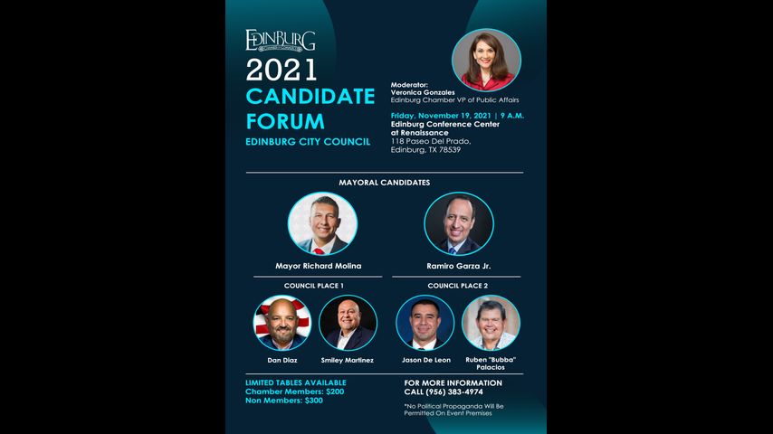 The Edinburg Chamber of Commerce will host a candidates forum, with six individuals running for city council, at 9 a.m. on Friday Nov. 19, at the Edinburg Conference Center at Renaissance.