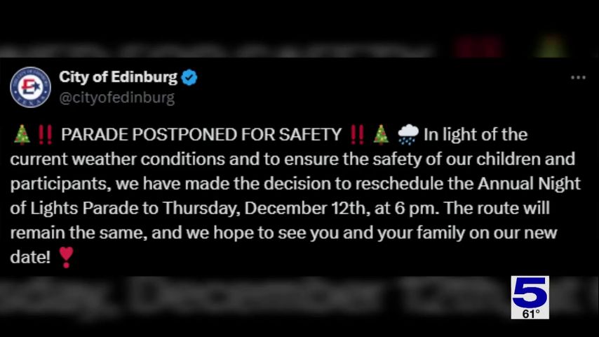 The city of Edinburg and the city of South Padre Island have postponed their holiday parades due to weather conditions.