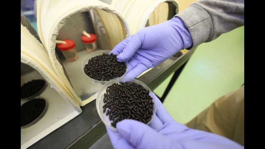 En la naturaleza, las larvas que están listas para la etapa de capullo o pupa —el equivalente a la etapa de crisálida de una mariposa— se desprenden de sus huéspedes, caen al suelo, se entierran a poca profundidad y se transforman en adultas dentro de su capullo, una envoltura protectora que les da la apariencia de una menta Tic Tac color marrón oscuro. En la fábrica de Panamá, los trabajadores las depositan en bandejas con aserrín.