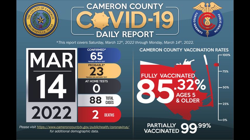 Los esfuerzos de vacunación continúan en todo el condado de Cameron; actualmente, el 85.32% de la población de cinco años y más está completamente vacunada.