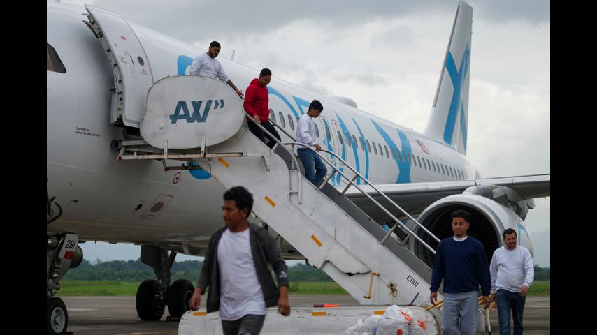 FILE - Honduras migrants who were deported from the U.S. deplane at Ramon Villeda Morales Airport, in San Pedro Sula, Honduras, Dec. 4, 2024. (AP Photo/Moises Castillo, File)