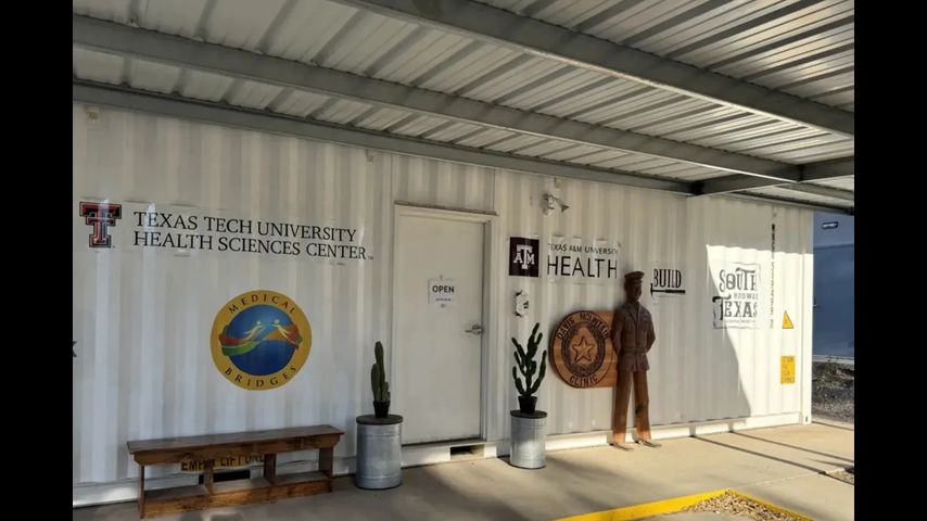 The retrofitted 40-foot container houses the new Davis Mountain Clinic in Fort Davis, a telehealth hub created through a partnership between Texas A&M and Texas Tech universities to connect residents with remote medical and mental health professionals.