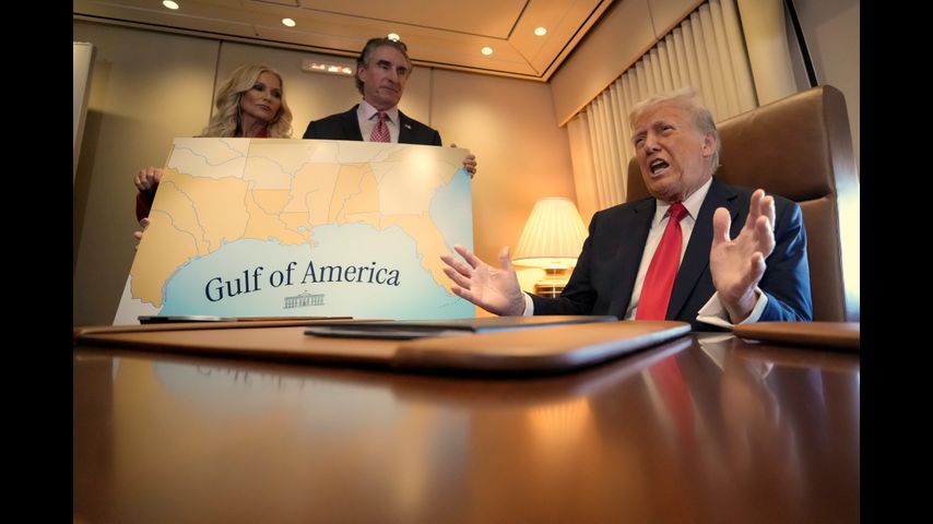 President Donald Trump, from right, speaks to reporters accompanied by Interior Secretary Doug Burgum and Burgum's wife Kathryn Burgum, aboard Air Force One where Trump signed a proclamation declaring Feb. 9 Gulf of America Day, as he travels from West Palm Beach, Fla. to New Orleans, Sunday, Feb. 9, 2025. (AP Photo/Ben Curtis)