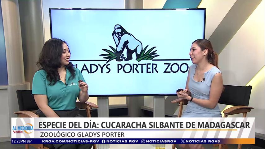 Alejandra Rodríguez, representante del Zoológico Gladys Porter, visita Noticias RGV para presentar a la especie del día: la cucaracha silbante de Madagascar.