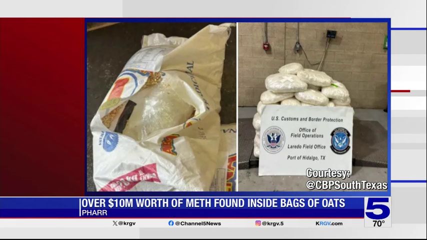 More than $10 million worth of meth was found inside a shipment of oat flakes attempting to enter the United States from Mexico through the Pharr International Bridge.