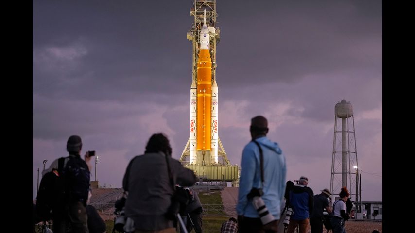 NASA's new Space Launch System rocket stands 322 feet (98 meters), shorter than the Apollo program's Saturn V rocket but more powerful at liftoff thanks to a pair of strap-on boosters. Atop the rocket is the Orion capsule carrying the astronauts.