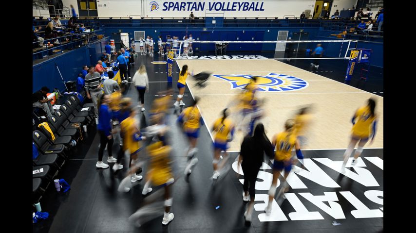 FILE -The San Jose State players take the court for warm ups before an NCAA women's college volleyball match against Air Force, Thursday, Oct. 31, 2024, in San Jose, Calif. (AP Photo/Eakin Howard, File)