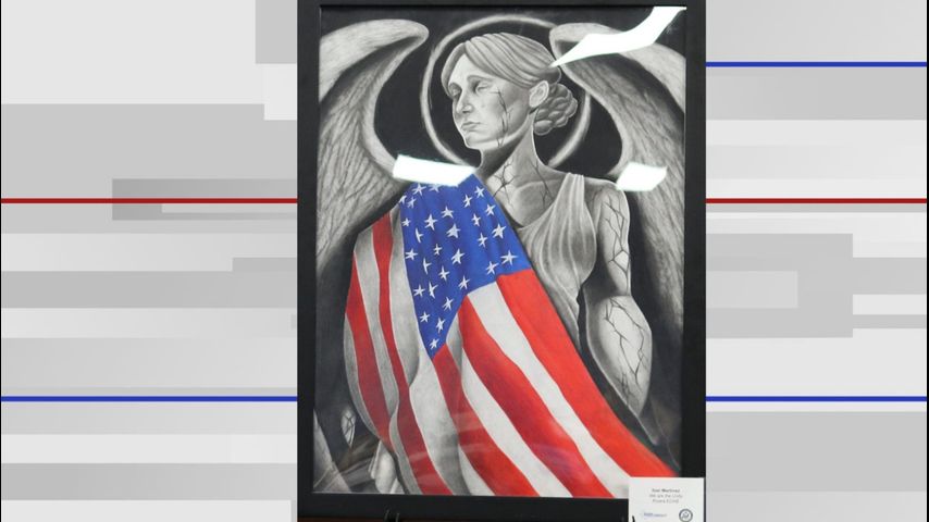Martinez's winning piece is titled "We are the Unity." The artwork shows an angel with open arms draped in an American flag.