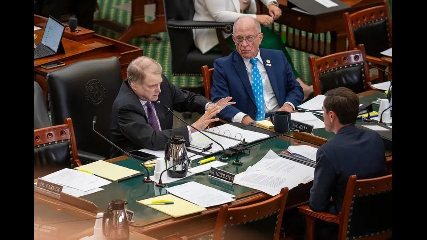 State Sen. Brian Birdwell R-Granbury, speaks with Sens. Bob Hall, R-Edgewood, and Mayes Middleton R-Galveston, during a committee hearing in the Senate Chambers at the Capitol on Aug. 4, 2025, in Austin. Credit: Ronaldo Bolaños/The Texas Tribune
