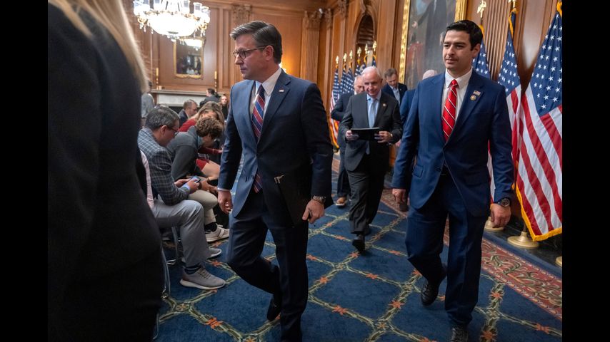 Speaker of the House Mike Johnson, R-La., left, leaves with Rep. Gabe Evans, R-Colo., right, after speaking with reporters at the Capitol in Washington, Thursday, Nov. 6, 2025. (AP Photo/Mark Schiefelbein)