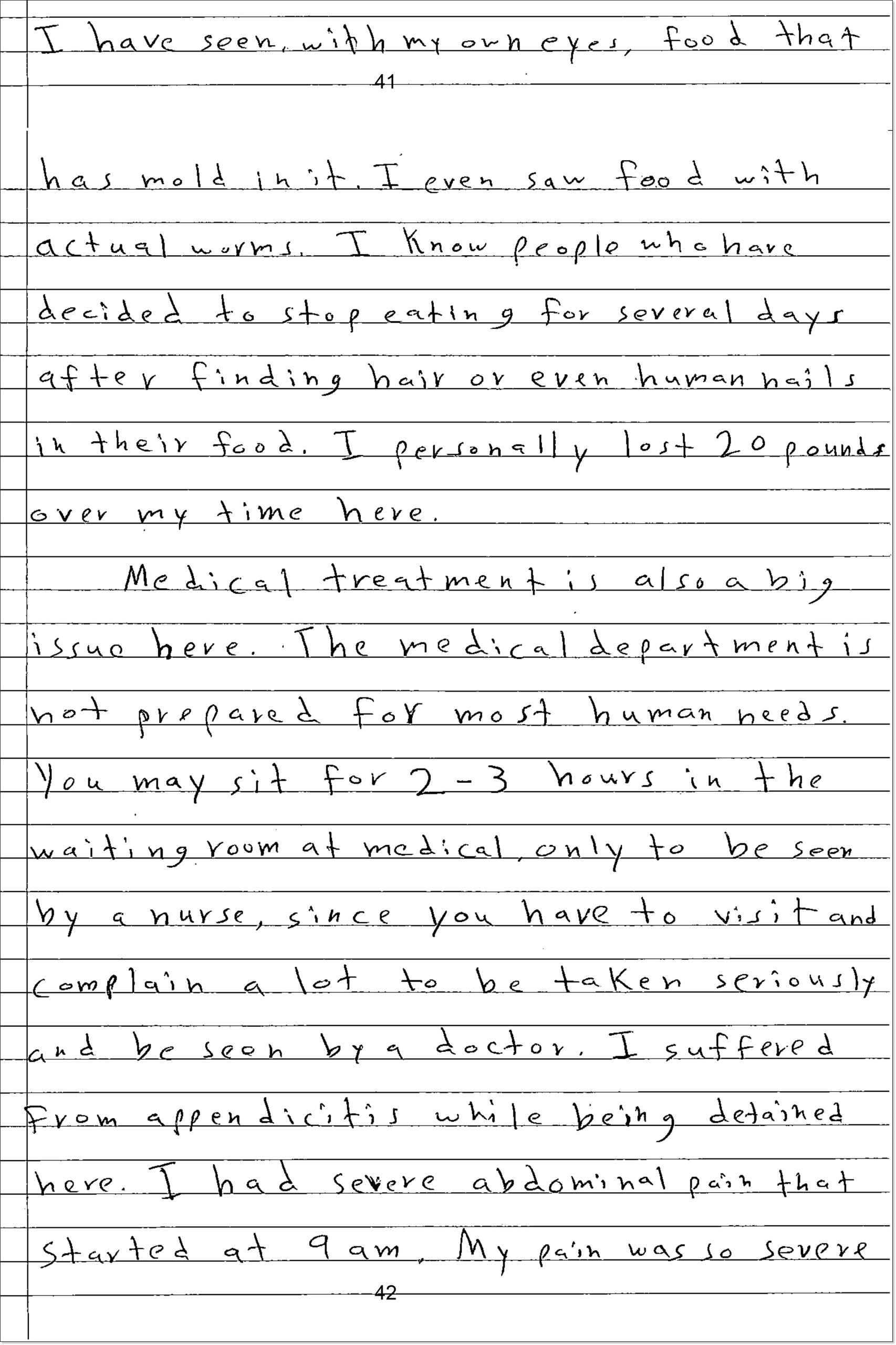 Among the complaints was finding a fingernail in her food and that her siblings frequently cry because there isn’t enough to eat. Her 16-year-old brother wrote that he’s lost 20 pounds while detained and that he saw mold and worms in food.