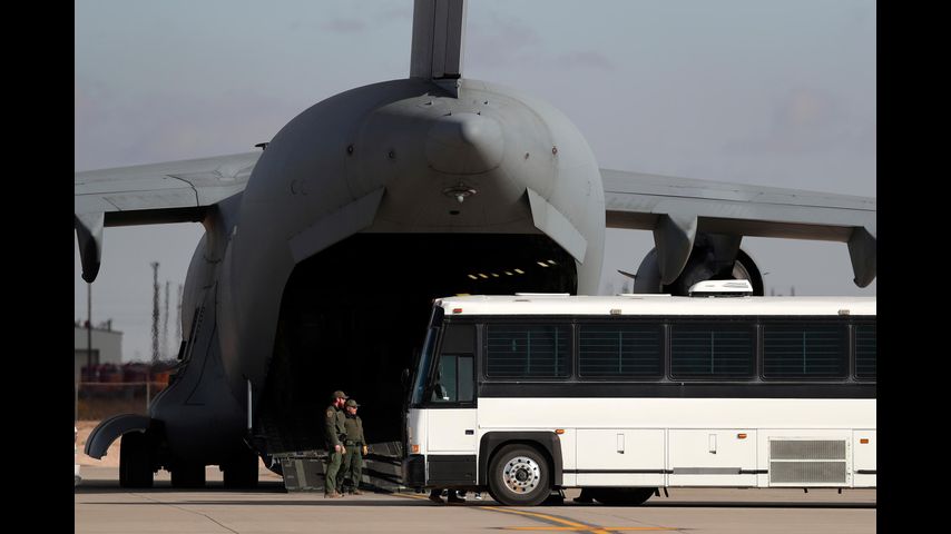 A military aircraft waits for migrants to board from a bus at Fort Bliss in El Paso, Texas, on January 30. The military base could house potentially thousands of migrants, two defense officials told CNN. Christian Chavez/AP/File via CNN Newsource
