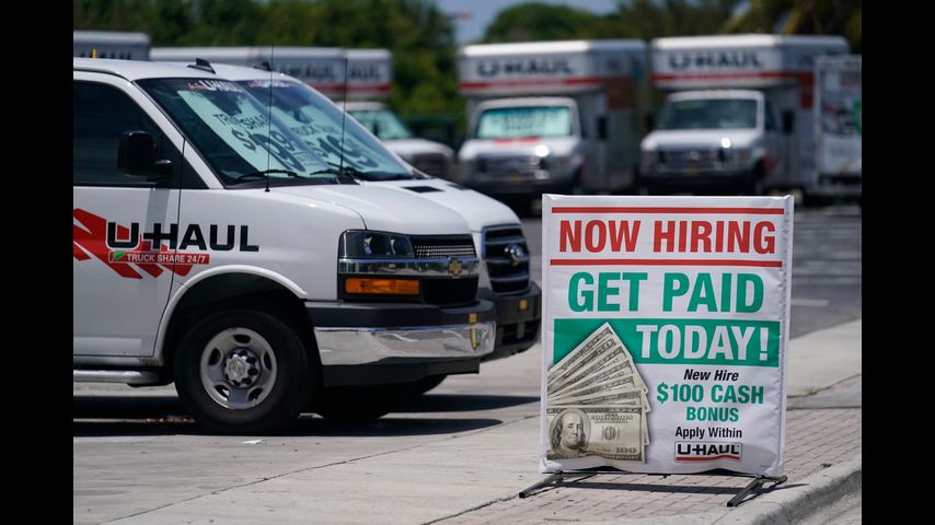 FILE - A sign at a UHaul store looking to hire employees is also offering a bonus, Thursday, May 20, 2021, in Boynton Beach, Fla. (AP Photo/Marta Lavandier, File)