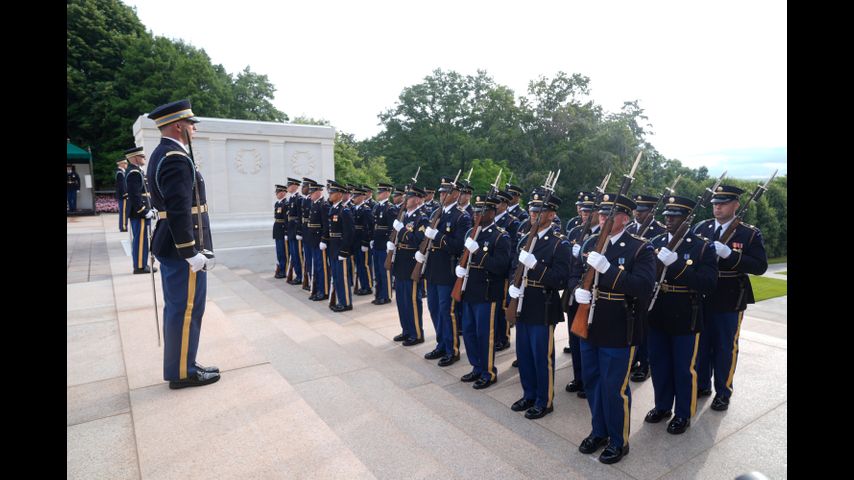 Soldiers prepare ahead of wreath laying ceremony at the Tomb of the Unknown Soldier at Arlington National Cemetery, honoring the Army's 250th anniversary and coinciding with President Donald Trump's 79th birthday, Saturday, June 14, 2025, in Arlington, Va. (AP Photo/Manuel Balce Ceneta)