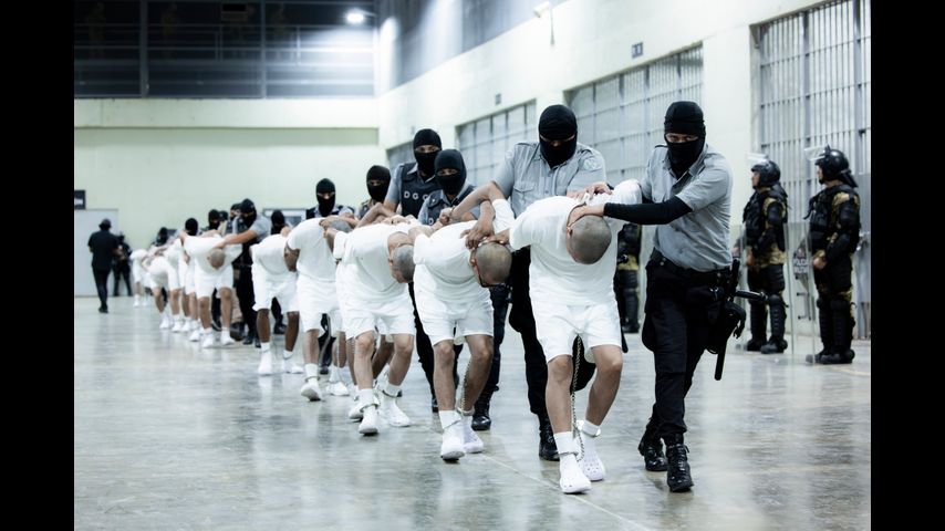 Video released by El Salvador's government Sunday showed men exiting airplanes onto an airport tarmac lined by officers in riot gear. The men, who had their hands and ankles shackled, struggled to walk as officers pushed their heads down to have them bend down at the waist.
