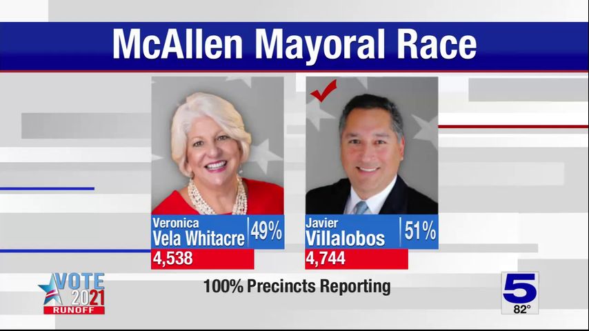 Unofficial election results show that in the run-off race for mayor of McAllen, city commissioner Javier Villalobos leads with 4,744 of the votes. His opponent, Veronica Vela Whitacre, trails with 4,538 of the votes.