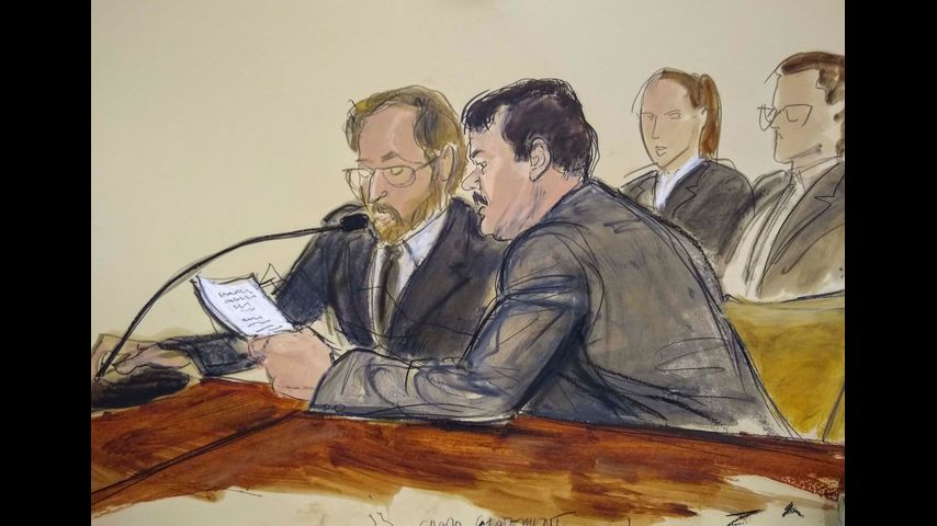 FILE - In this courtroom sketch, Joaquin "El Chapo" Guzman, foreground right, reads a statement through an interpreter during his sentencing in federal court, July 17, 2019, in New York. A US appeals court affirmed on Tuesday, Jan. 25, 2022 the conviction of Joaquín “El Chapo” Guzmán, who had asked for his 2019 indictment for drug trafficking to be dismissed. (Elizabeth Williams via AP, File)