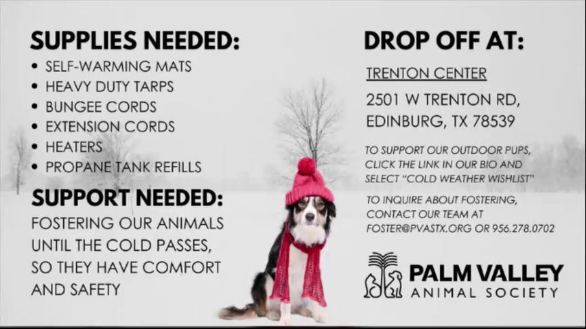 Temperatures are expected to drop on Monday. The Palm Valley Animal Society is asking for supplies such as self-warming mats, tarps, heaters and propane tanks.