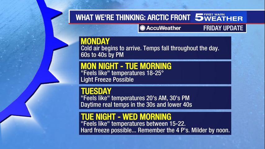 The front is expected to bring colder temperatures throughout the day on Monday. Temperatures are expected to start in the 60s or 50s before cooling down into the 40s by early Monday afternoon.