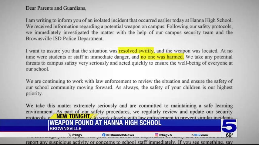 Chavez said they received information regarding a potential weapon on campus. The campus security team and the Brownsville ISD Police Department swiftly investigated the situation and were able to locate the weapon.